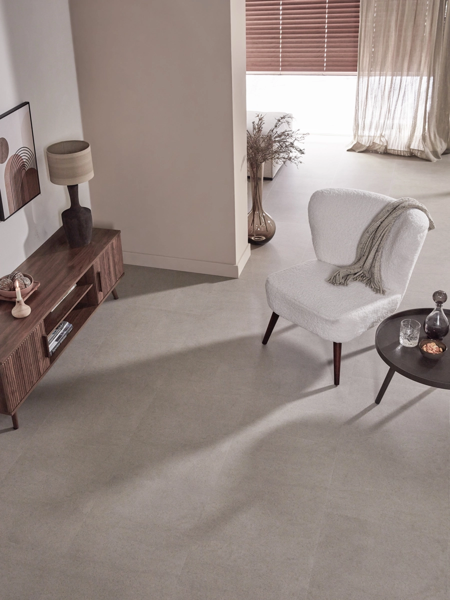 Der Vinyl-Boden in Betonoptik Greige hat eine Nutzschicht von 0,55 mm und fällt in die Nutzungsklasse 32. Damit eignet sich dieser Boden auch für eine intensive gewerbliche Nutzung und ist die perfekte Wahl für Familien mit Kindern und Haustieren. Dank seiner 100-prozentigen Wasserbeständigkeit eignet sich dieser Boden auch hervorragend für Feuchträume wie Küche oder Bad. Die MEGAMAT-Oberfläche bietet nicht nur ein luxuriöses, mattes Aussehen, sondern auch zusätzliche Griffigkeit, was den Boden besonders sicher macht.