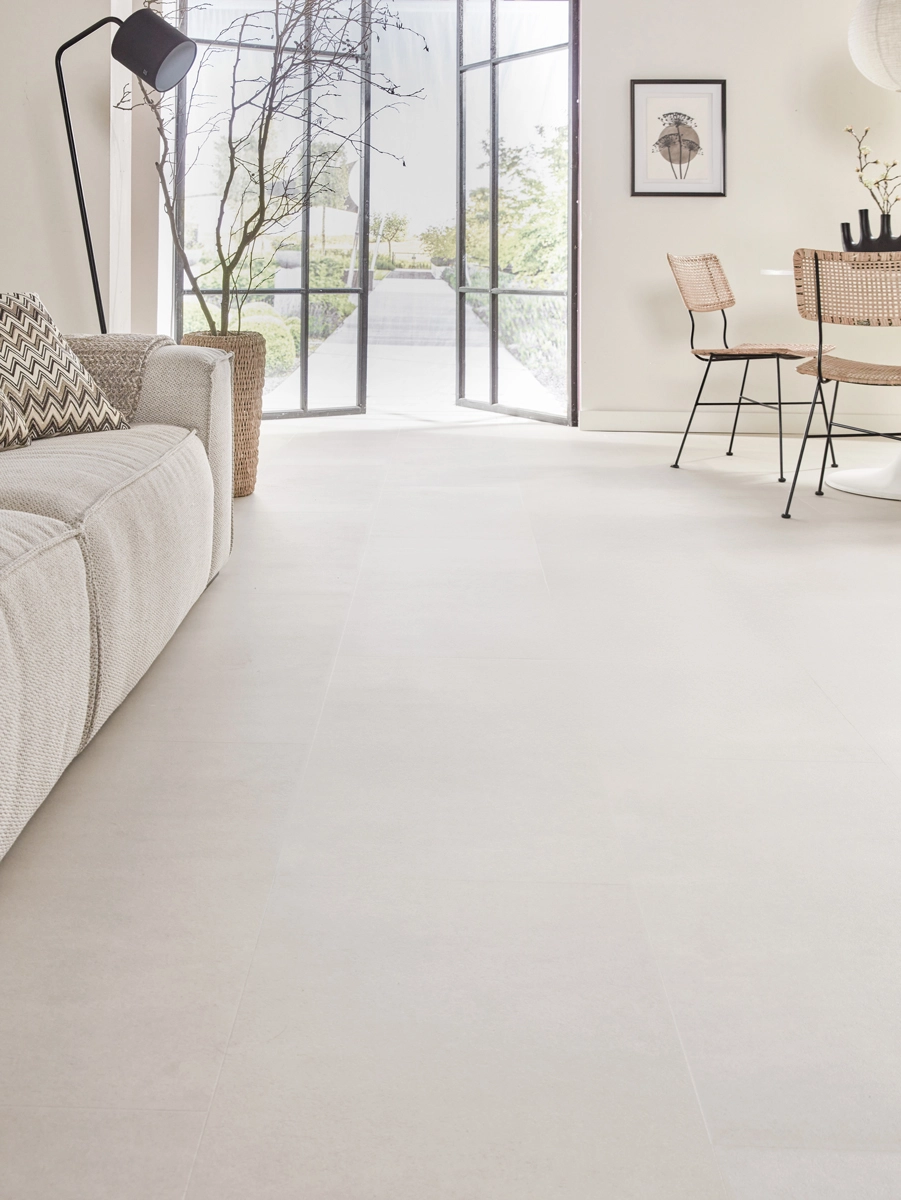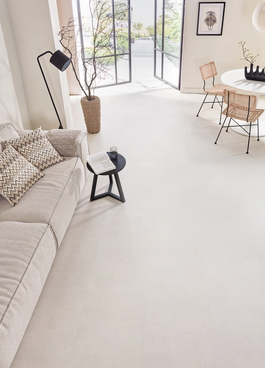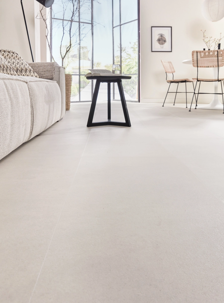 Die Bodenfliese Vinyl – Betonoptik Sand kombiniert die zeitlose Optik von Beton mit dem Komfort von Vinyl. Dank der einzigartigen MEGAMAT-Oberfläche und dem sandfarbenen Farbton verleiht diese Vinyl-Bodenfliese Ihrem Interieur eine sanfte, moderne Atmosphäre. Mit seiner haptischen Struktur und den großzügigen Maßen von 91,4 x 45,7 cm sieht es aus wie eine authentische Betonfliese, bietet aber alle Vorteile von Vinyl.