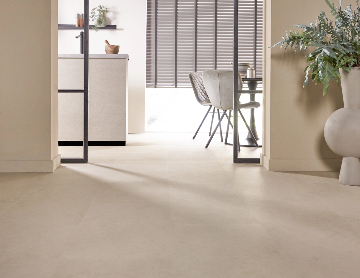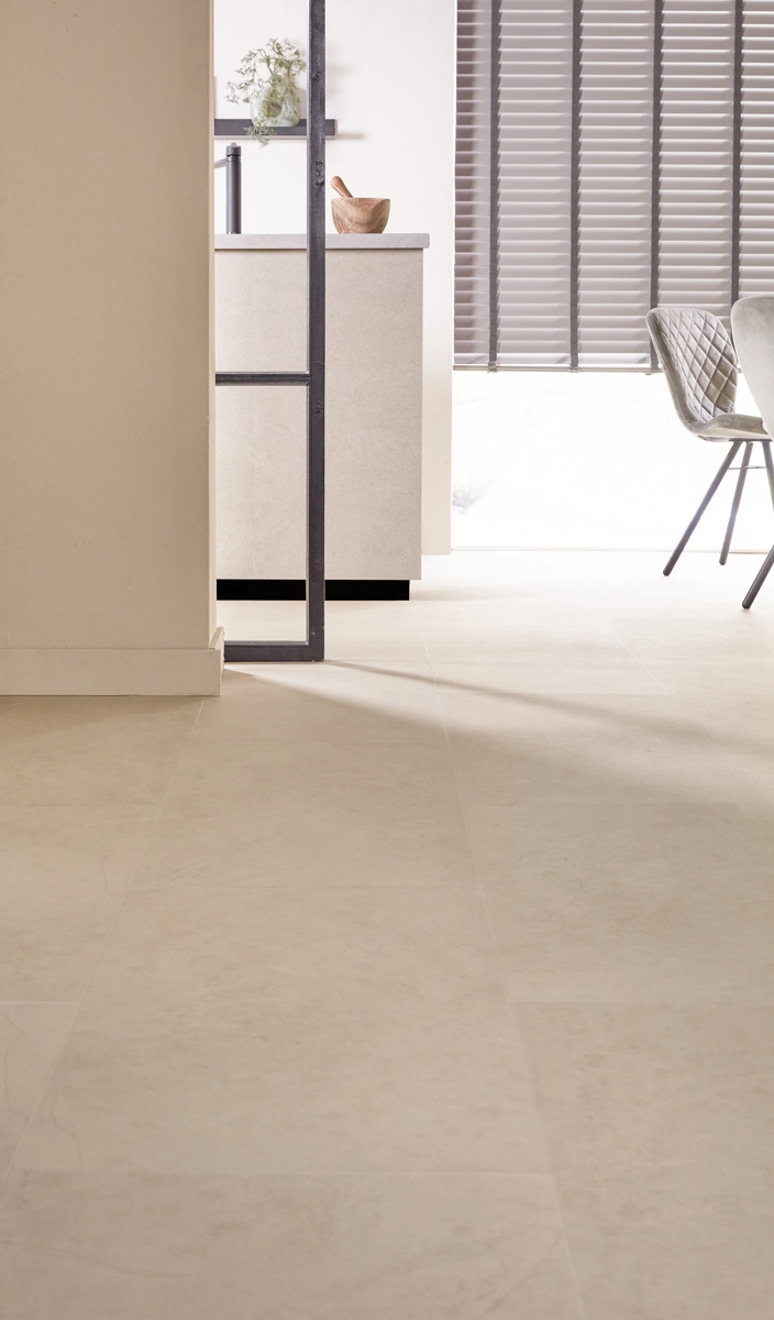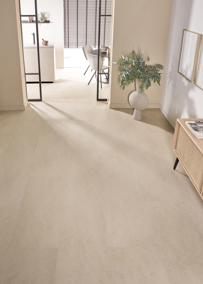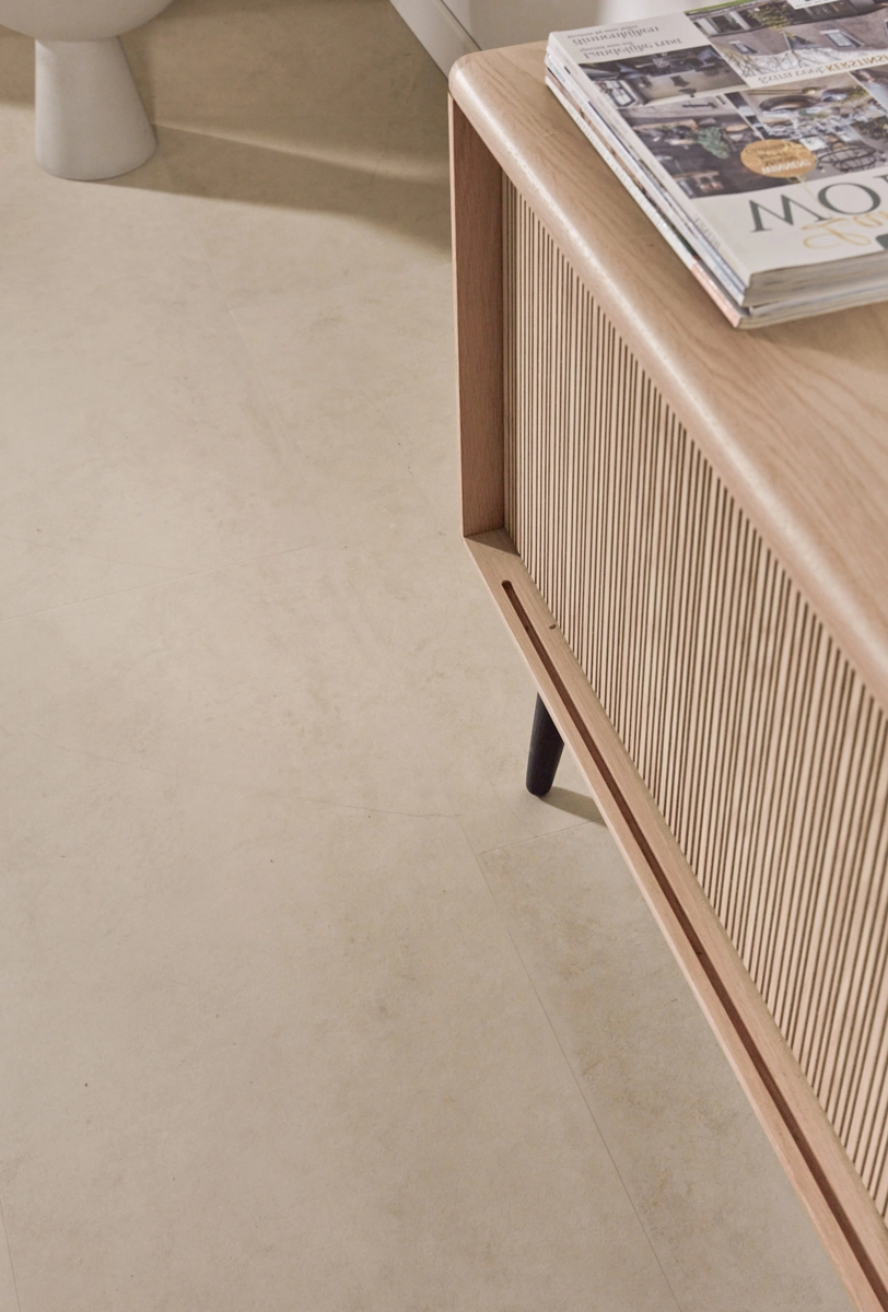 Von nassen Socken nach dem Duschen bis hin zur verschütteten Tasse in der Küche – diesem hellgrauen Fliesenboden ist alles egal. Dank seiner 100 % wasserdichten Konstruktion eignet er sich perfekt für Feuchträume wie Bad, Flur oder Küche. Und dank seines geringen Wärmedurchlasswiderstands von nur 0,039 m²K/W funktioniert er perfekt mit Fußbodenheizung und -kühlung. Praktisch und komfortabel.