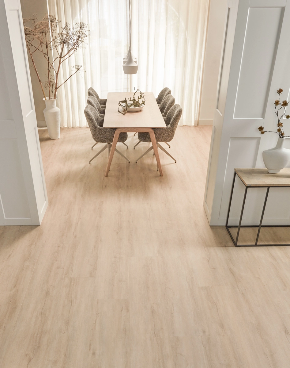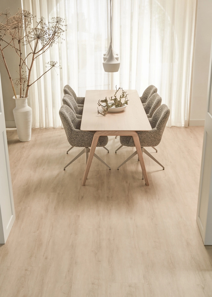 Der Floer Landhaus Vinyl - Creme Eiche ist die perfekte Wahl für alle, die einen robusten, breiten Vinyl-Boden in warmer, heller Eichenoptik suchen. Mit extra breiten XXL-Dielen von 154 cm Länge und 31 cm Breite verleiht dieser Boden Ihrem Interieur eine robuste Ausstrahlung und ein großzügiges Raumgefühl.Dank der fühlbaren Holzstruktur mit der matten MEGAMAT-Oberfläche fühlt es sich an, als würden Sie echte massive Eiche in Ihr Zuhause holen, jedoch mit allen Vorteilen von Floer Vinyl.