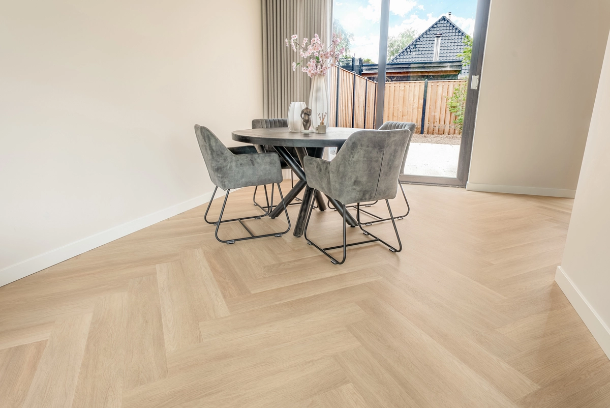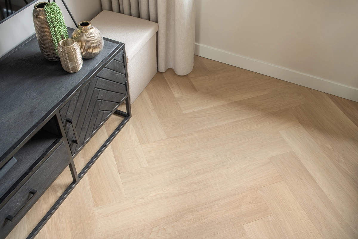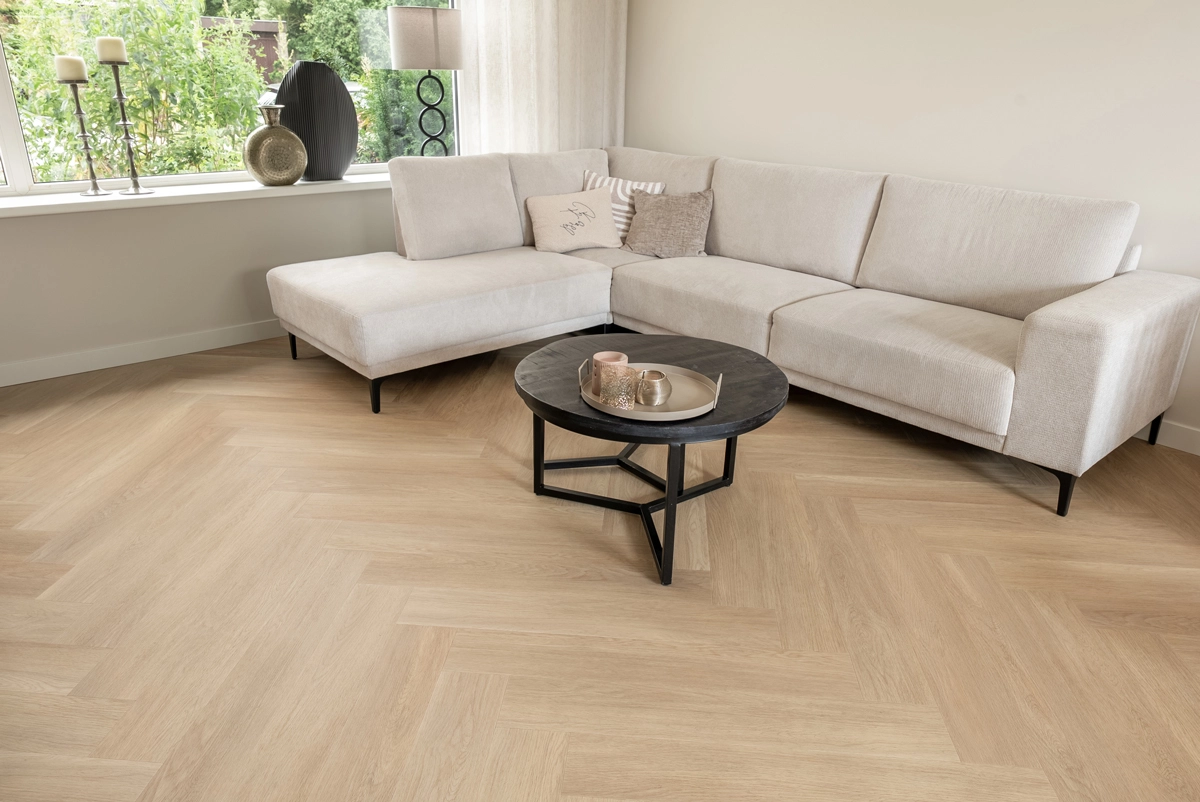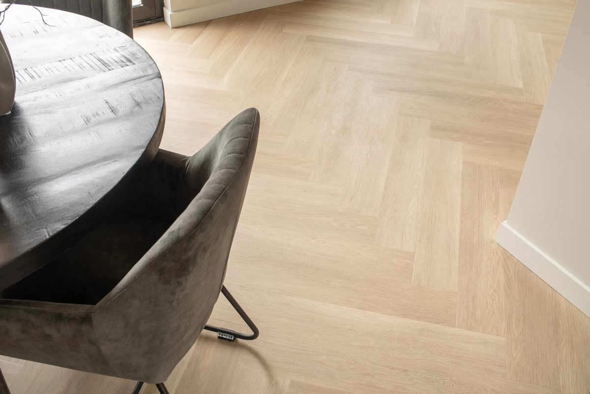 Lerne den außergewöhnlichen Floer Walfischgrät Klick Vinyl - Nordkaper Natur kennen, einen beeindruckend schönen Boden, den du auch selbst verlegen kannst! Mit seinem eleganten natürlichen Farbton verströmt dieser Walfischgrät Klick-Vinyl-Boden den Charme eines authentischen Eichenbodens mit allen Vorteilen von Klick-Vinyl. Diese großen Klick-Vinyl-Böden im Fischgrätmuster sind die größere, breitere und längere Version der "Standard"-Klick-Vinyl-Böden im Fischgrätmuster. Da Walfischgrät-Vinyl-Klickböden mit einem starren Mineralkern ausgestattet sind, stehen sie extrem stabil auf dem Boden und sind 100% wasserdicht.